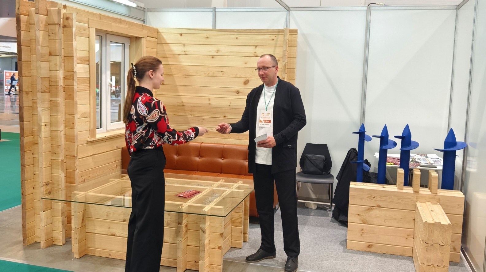 Ежегодное участие в строительных выставках — наш осознанный выбор. Мы привозим настоящие образцы стен с технологическими разрезами, чтобы вы могли лично оценить качество, изучить все слои конструкции, потрогать руками экологичный утеплитель эковату, а также увидеть в разрезе как соединяются элементы двойного бруса.
