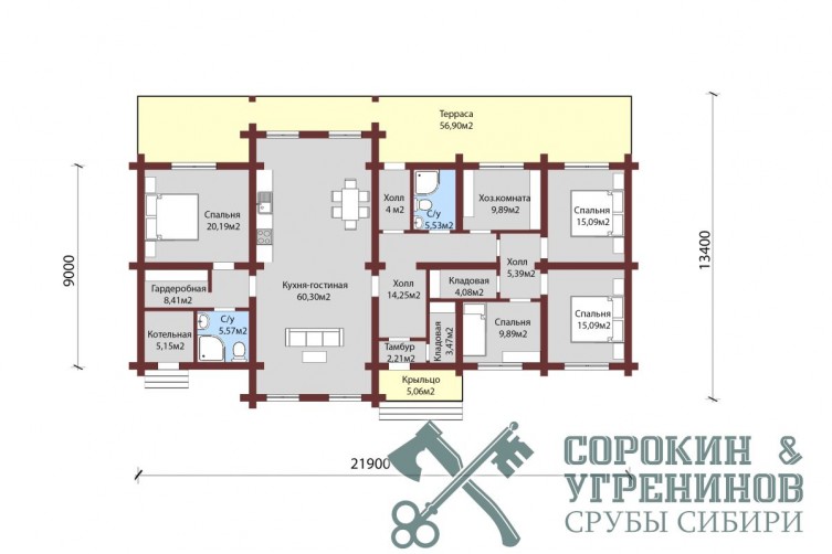 Индивидуальный проект жилого дома из лафета сечением 250х400мм. Общая площадь дома 250м2. Одноэтажный дом имеет несколько комнат, некоторые внутренние стены выполнены по каркасной технологии, что экономит стоимость сруба и увеличивает внутреннее пространство дома. Возможно сделать антрессоль, что позволит увеличить площадь дома, сделать дополнительные спальные места.